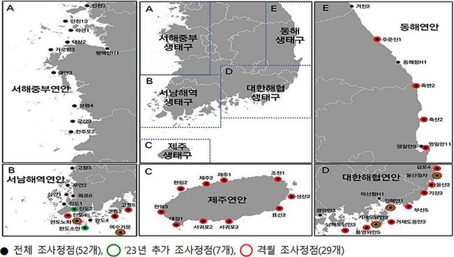 해양수산부는 해양 방사능오염을 철저히 모니터링하기 위해 연안해역 52개(올해 2월부터 확대) 조사정점에서 해수, 해저퇴적물, 해양생물을 대상으로 방사성세슘 등 방사능농도를 조사하고 있다.