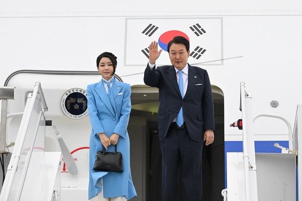 ▲ 윤석열 대통령과 김건희 여사가 4월24일 미국 국빈 방문을 위해 공군 1호기에 탑승하기 전 환송객들에게 인사하는 모습.(자료화면=대통령실 제공)이 대변인은 “현재 국제질서가 대변화하는 중요한 시기에 G7 정상들과의 만남을 통해 안보, 경제산업 등에서 국제적 연대를 공고히 하면서 우리의 국가 이익도 최대화 하는 계기가 될 것으로 기대한다”고 말했다.