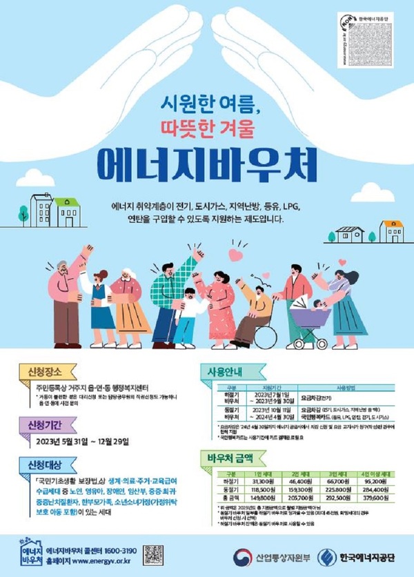 산업통상자원부는 오는 31일부터 12월 29일까지 전국 읍·면·동 행정복지센터 및 온라인 홈페이지(www.bokjiro.go.kr)에서 2023년도 에너지바우처 사업을 신청·접수한다고 25일 밝혔다.