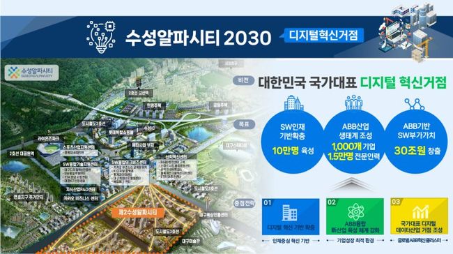 대구시는 ‘23년 말까지 약 250여개 디지털 기업의 입주가 완료 예정인 수성알파시티를 중심으로 “인공지능(A)-빅데이터(B)-블록체인(B), 이른바 에이비비(ABB) 중심의 디지털 혁신거점을 조성”하겠다는 비전하에,