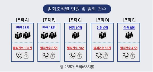 2명으로 구성된 범죄조직이 160개로 가장 많았고, 가담자 규모가 가장 큰 조직은 18명에 이르는 것으로 나타났다.