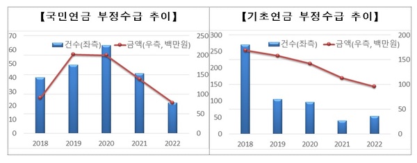 ▲ 국민연금 기초연금 부정수급 발생현황.지난 1월에는 자녀가 모친 사망 사실을 신고하지 않고 2년 동안 국민·기초연금을 수령한 사례가 발생하기도 했다.