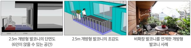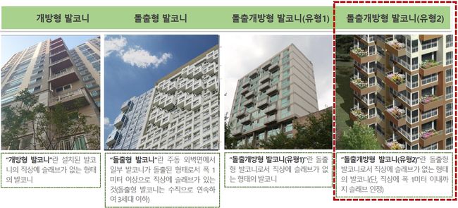 확장 불가능한 `돌출개방형 발코니`는 돌출 폭 2.5미터 이상, 난간 유효높이 1.5m, 둘레 길이의 50% 이상이 벽․창호 등으로 막히지 않고 개방된 형태를 갖추면 된다. 이 기준은 바로 적용 가능하며 이미 허가가 완료된 아파트에도 설계변경을 통해 적용할 수도 있다.