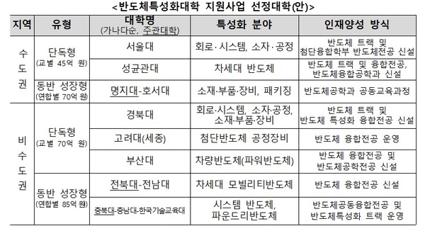 비수도권 단독형은 경북대(회로·시스템, 소자·공정, 소재·부품·장비), 고려대(세종, 첨단반도체 공정장비), 부산대(차량반도체)가, 비수도권 동반성장형에는 전북대-전남대(차세대 모빌리티반도체), 충북대-충남대-한국기술교육대(시스템 반도체, 파운드리반도체)가 선정됐다.