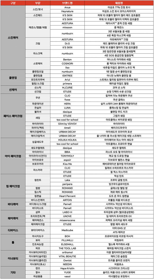 각 부문별 수상한 제품은 아래와 같다. 특히, ‘스킨/토너’, ‘에센스/앰플/세럼’, ‘마스크팩’, ‘크림’, ‘스팟케어’, ‘쿠션’, ‘섀딩’, ‘싱글섀도우’, ‘아이라이너’, ‘마스카라’, ‘립틴트’, ‘뷰티디바이스’ 등 12개 부문은 경쟁이 치열했던 만큼 각 부문 내에서 2개 이상의 제품이 수상의 영광을 안았다.