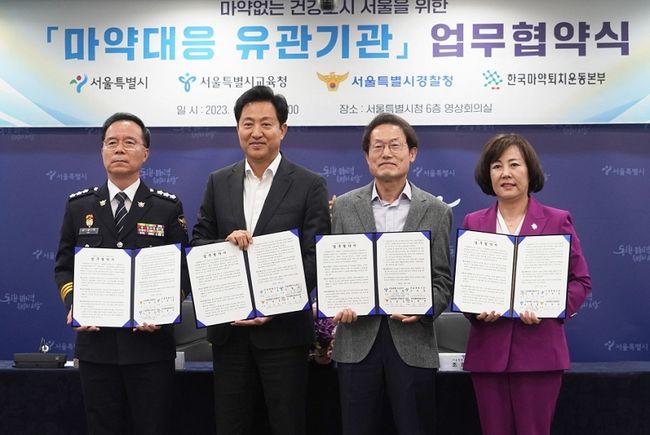 4개 기관은 세계마약퇴치의 날(6.26.)을 맞아 6.19. 서울시청에서 오세훈 시장(서울시)-조희연 서울시교육감(교육청)-김광호 서울경찰청장(경찰청)-김필여 한국마약퇴치운동본부 이사장(이하 ‘한국마퇴본부’)이 참석해 ‘마약없는 건강도시 서울’ 업무협약을 체결하고, 협력을 강화한다.