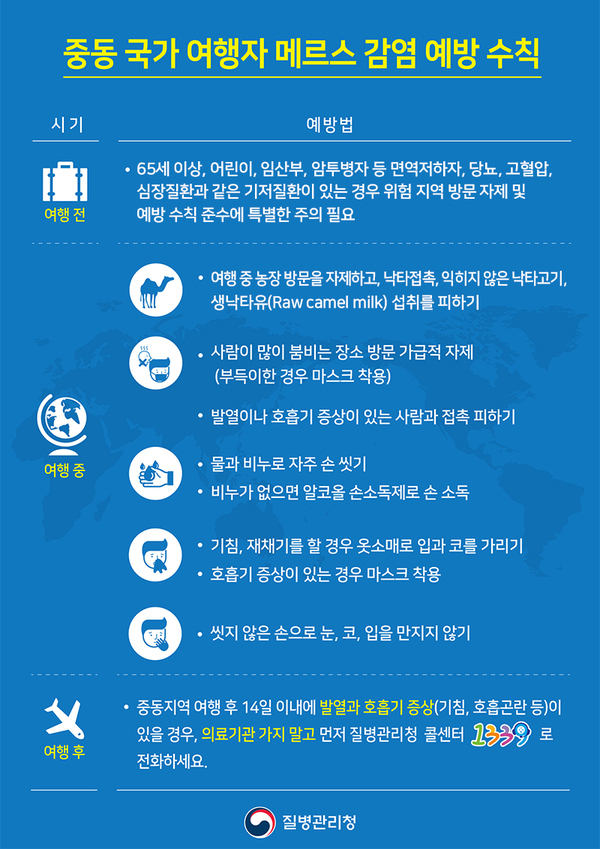 중동 국가 여행자가 알아야 할 메르스 감염 예방 수칙을 알아본다.