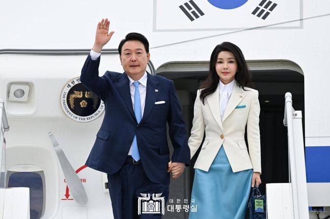 윤석열 대통령 부부가 6월19일 파리 오를리 공항에 도착하여 인사를 하고 있다.