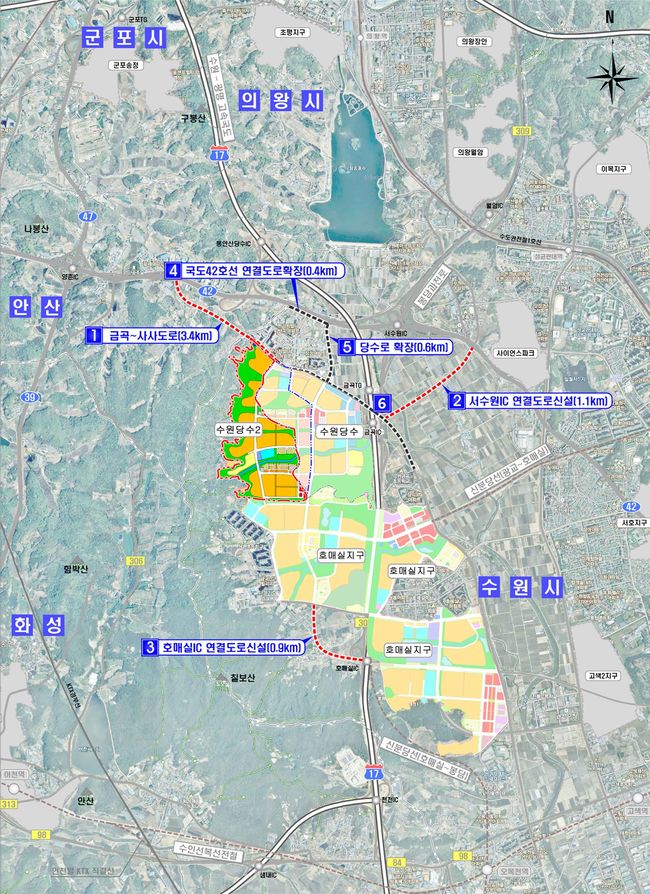 이 지구는 수원-광명 및 과천-봉담 고속도로, 국도 42호선, `29년 개통예정인 신분당선 호매실역을 이용할 수 있어 광역교통 접근성이 뛰어나며, 지구 조성 시 교통난 해소를 위해 서수원 IC 및 호매실 IC 연결도로 신설, 국도 42호선 연결로 확장 등 교통개선대책도 시행될 예정이다.