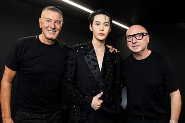 럭셔리 패션 하우스 돌체앤가바나의 한일 앰버서더인 NCT 도영이 지난 6월17일(현지 시각) 밀라노 메트로폴에서 열린 ‘돌체앤가바나 2024 봄-여름 남성 패션쇼’에 참석했다. 사진 왼쪽부터 순서대로 스테파노 가바나, 도영, 도메니코 돌체 (사진제공: 돌체앤가바나)