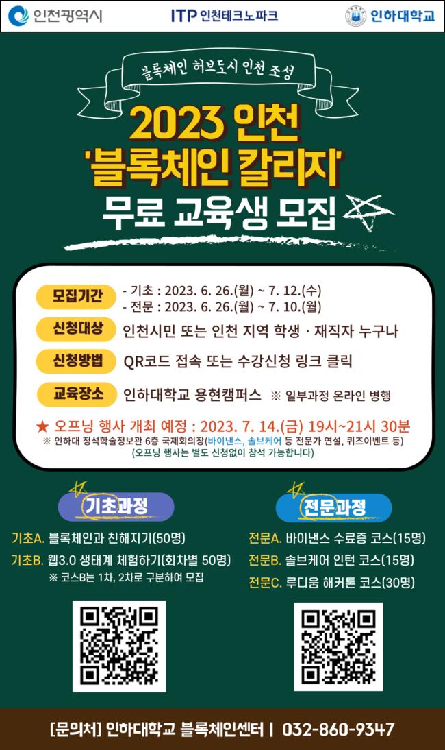 인천광역시는 지난 2일 지역 블록체인 인재양성 및 기술역량 강화를 위한 ‘인천 블록체인 칼리지’사업을 본격적으로 착수하고 기초교육 150명, 전문교육 60명 등 210명의 교육생을 모집한다고 밝혔다.