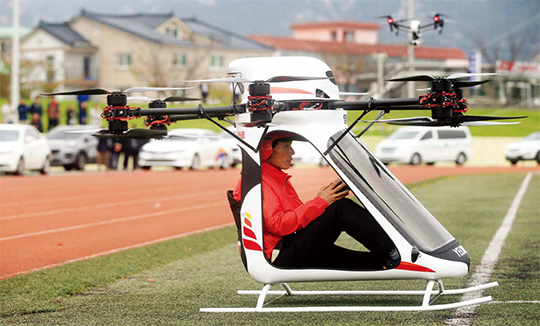 | 미래 직업으로 빅데이터, 인공지능, 드론(무인항공기) 등과 관련된 직업들이 뜨고 있다. 사진은 드론에 사람이 탑승한 채 시험비행을 하는 모습. (사진=동아DB) |