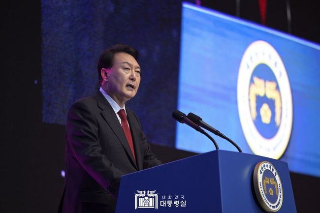 윤석열 대통령은 28일 오전 서울 장충체육관에서 개최된 `한국자유총연맹 제69주년 창립기념행사`에 참석, 축사를 하고 있다.