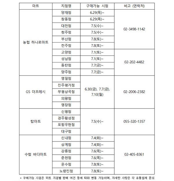 ▲ 정부 비축 천일염 구매 가능 마트 점포. (자료=해양수산부)해수부는 전국 전통시장에도 천일염을 공급하며 오는 30일 수협중앙회 누리집(www.suhyup.co.kr)을 통해 시장명을 확인할 수 있다.