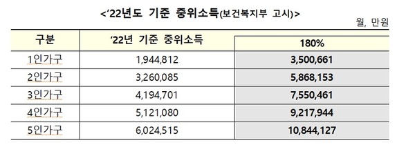 가구소득의 경우 신청자 본인을 포함한 가구원(배우자, 부모, 자녀, 미성년 형제·자매) 소득의 합이 지난해 기준 중위소득의 180% 이하여야 한다.