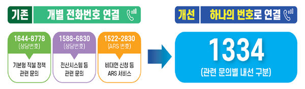 ▲ 통합안내센터 전화번호 전·후 비교. (인포그래픽=농림축산식품부)앞으로는 농업인이 기존의 8자리 개별번호가 아닌 ‘1334’ 4자리 번호로 전화를 걸면 원하는 서비스를 제공받을 수 있다.