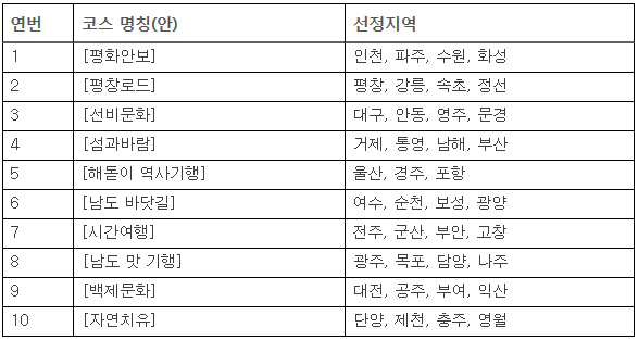 1차로 선정된 대한민국 테마여행 10선 코스