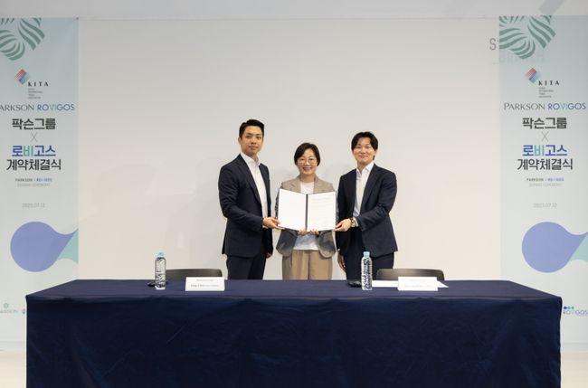 한국무역협회는 12일 삼성동 스타트업브랜치에서 국내 물류 스타트업 로비고스와 말레이시아 팍슨 백화점 간 재고관리 시스템 납품 계약 체결식을 진행했다. (사진 왼쪽부터 팍슨그룹 최정 신사업개발부장, 한국무역협회 이명자 디지털혁신본부장, 로비고스 김태용 대표)