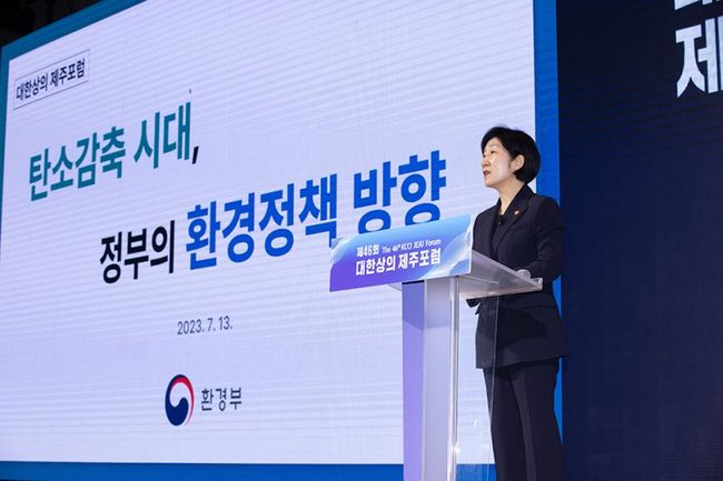 [일간환경연합 장민주 기자] 한화진 환경부 장관은 13일 오전 제주 해비치호텔에서 열린 ‘2023 대한상의 제주 포럼’에서 ‘탄소감축 시대, 정부의 환경정책 방향’이라는 주제로 정책강연을 했다고 밝혔다.