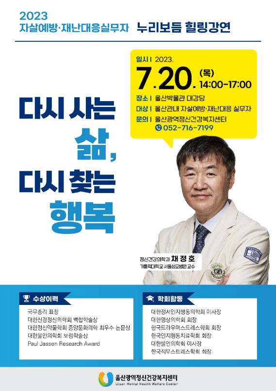 이번 강연은 자살예방·재난대응 실무자 등 100여 명이 참석한 가운데 ‘다시 사는 삶, 다시 찾는 행복’을 주제로 진행한다.