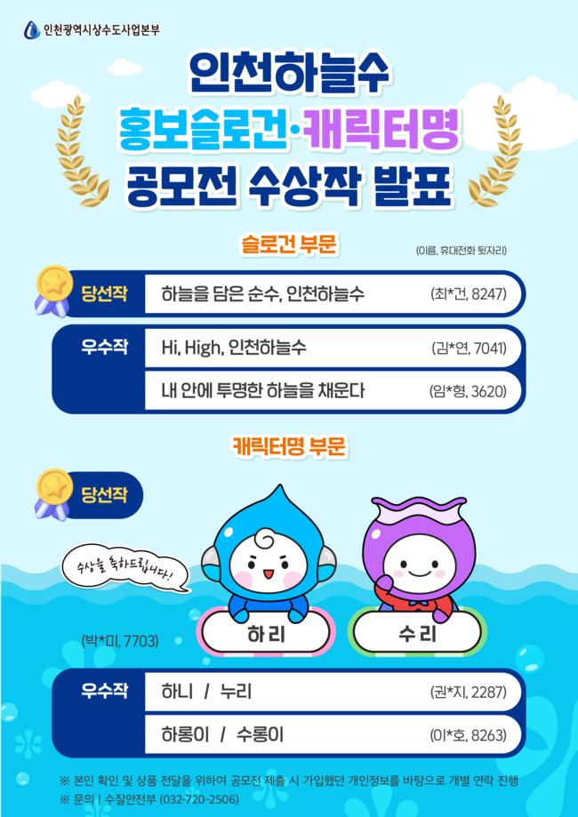시민 선호도조사 결과, 슬로건 부문은 투명하고 청명한 하늘을 닮아 티 없이 맑고 깨끗하다는 의미를 함축한 “하늘을 담은 순수, 인천하늘수”가 당선작으로 선정됐으며 “Hi, High, 인천하늘수”와 “내 안에 투명한 하늘을 채운다, 인천하늘수”가 우수작으로 선정됐다.