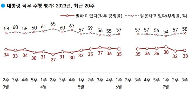 한국갤럽이 지난 18~20일 전국 만 18세 이상 1001명을 대상으로 실시해 이날 공개한 여론조사 결과에 따르면, 윤 대통령 직무평가에 대해 33%가 긍정 평가했고 58%는 부정 평가했으며 그 외는 의견을 유보했다(어느 쪽도 아님 2%, 모름/응답거절 7%).