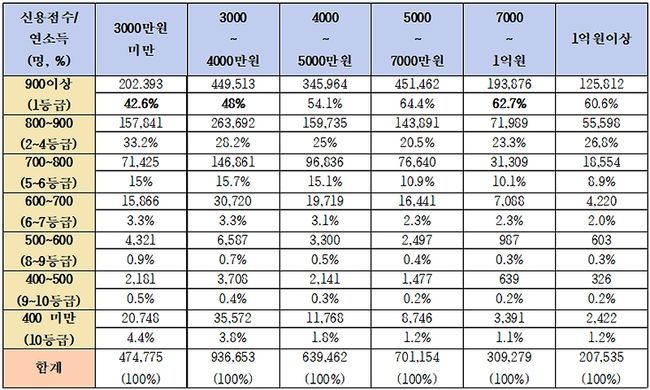 2022년 기준 연소득 7천만원 ~ 1억원 이상 구간 자영업자 약 30만명 중 신용등급 1등급에 해당하는 900점 이상 차주는 19만명으로 62.7%를 차지했다.
