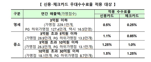 연매출 30억 원 이하 PG 하위가맹점 162만6000개와 연매출 3억 원 이하 개인택시사업자 16만 5000명에 대해 0.5~1.5%의 우대수수료율이 적용된다.