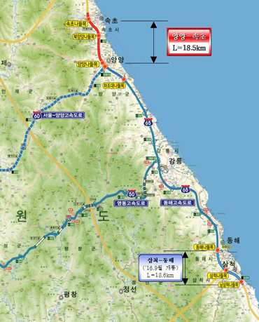 이에 따라 앞으로는 동해고속도로를 타고 삼척에서 속초까지 한 번에 갈 수 있게 된다.