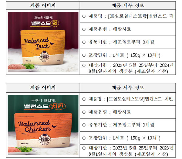 회수·폐기 대상 제품은 멸균, 살균 등을 위한 공정이 제대로 이행되지 않은 지난 5월 25일부터 지난 1일까지 제조된 토실토실레스토랑(브랜드)의 밸런스드 덕과 밸런스드 치킨 2개 제품이다.