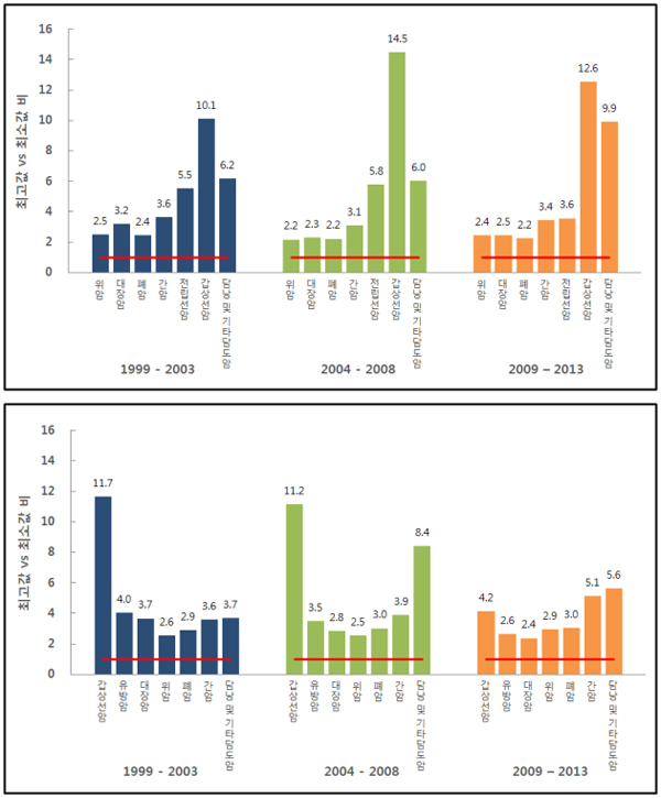연도별 암종별 지역간 암발생률비 위쪽이 남자 아래쪽이 여자이다.