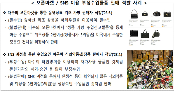 ▲ 오픈마켓, SNS 이용 부정수입물품 판매 적발 사례. (자료=관세청)한편, 관세청은 지난 2020년부터 온라인상에서 부정수입물품의 유통을 방지하고 소비자 피해를 예방하기 위해 오픈마켓 등 통신판매중개업자를 대상으로 ‘부정수입물품 유통실태 조사’를 실시하고 있다.
