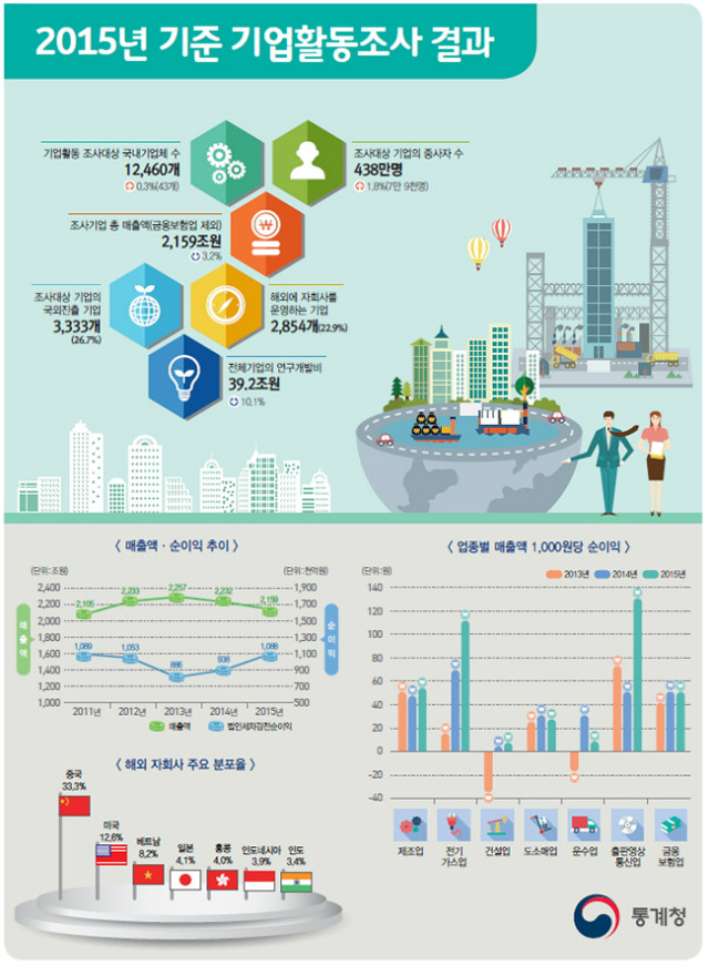 [일간환경연합 신상미 기자]2015년 기준 기업활동조사 결과, 전체 기업체 수는 12,460개로 작년에 비해 0.3% 증가했습니다. 기타서비스업, 부동산임대업, 도소매업 등은 증가하였으나 제조업, 건설업은 감소했습니다.