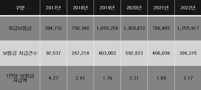 017-2022 보험회사 연도별 자연재해 보험지급금 추이 (단위: 백만원, 건) (장혜영 의원실에서 금융감독원 제출자료를 재구성. 태풍, 홍수, 호우, 강풍, 풍랑, 해일, 대설, 한파 등 자연재난으로 인하여 발생하는 피해를 보상하는 보험에 대하여 작성됨. 풍수해보험 및 농작물재해보험 등 정책보험 및 자연재해를 담보하는 재물보험, 재산종합보험, 화재보험 등을 모두 포함함. 자연재해 담보로 인하여 지급된 경우에 한정함)