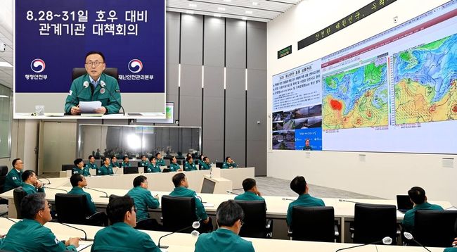 이한경 행정안전부 재난안전관리본부장이 지난 28일 정부세종청사 중앙재난안전상황실에서 `8.28 · 31일 호우 대비 관계기관 대책회의`를 주재하고 있다.