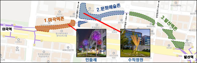 구는 지난 2020년부터 마곡문화거리 전체를 마곡역존, 문화예술존, 발산역존 3개의 구간(존)으로 구분하고 단계별로 전시물을 설치하고 있다.