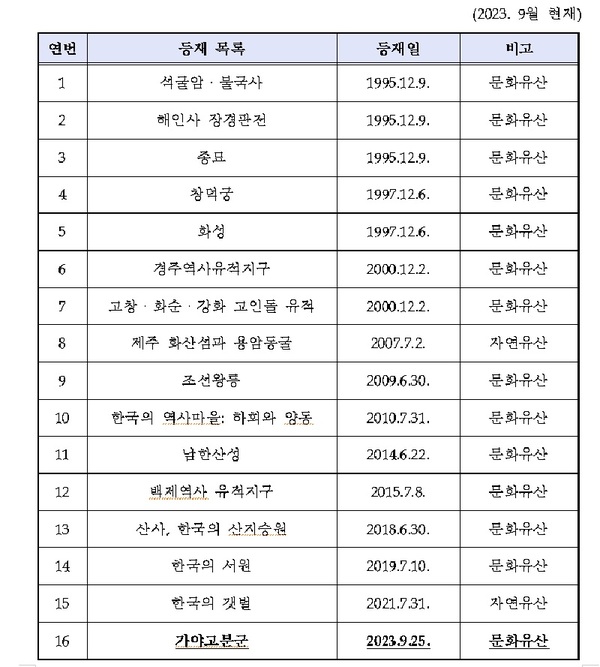 ▲ 유네스코 세계유산 등재 현황. (자료=문화재청)가야고분군은 지난 2013년 세계유산 잠정목록에 등재된 이후 2021년 1월 유네스코로 신청서가 제출됐다.
