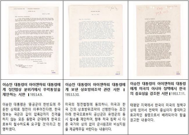 이승만 대통령과 미국의 아이젠하워 대통령, 덜레스 국무장관, 한국에 특사로 온 로버트슨과의 협상 과정을 보여주는 서한문은 정전협정에서 한미동맹에 이르기까지의 역사를 보여준다.