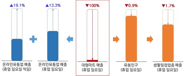대형마트의 휴일 의무휴업은 휴업 당일과 익일 주변 상권 온라인유통업의 매출을 증가시켰다. 온라인유통업은 대형마트 휴업 일요일 13.3% 증가, 휴업 직후 월요일 19.1% 증가했다.