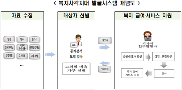 복지 사각지대 발굴시스템이란 단전, 단수 등 13개 기관별 정보를 분석해 위기 상황에 있는 취약 계층을 발굴하고 예측하는 시스템을 말한다.