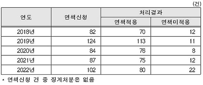 국세청 면책 신청건수를 연도별로 살펴보면 2018년 82건, 2019년 124건, 2020년 84건, 2021년 87건, 2022년 102건이다. 이 중 적용은 2018년 70건, 2019년 113건, 2020년 76건, 2021년 75건, 2022년 80건이다.