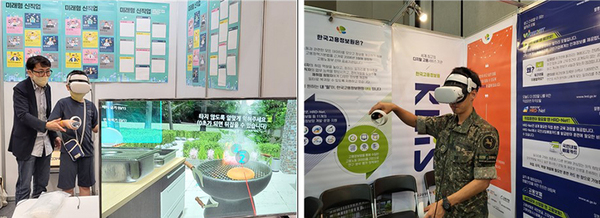 ▲ VR 콘텐츠 체험 부스 사진 중 지난 7월 15일에 개최한 서울 진로직업박람회(왼쪽)와 9월 13일에 열린 국군장병 취업박람회. (사진=한국고용정보원 제공)미래직업 VR 체험관에서는 가상공간디자이너가 되어 가상공간 속 박물관을 자유롭게 구성할 수 있다.