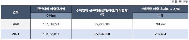 반면 비수혜업체는 2021년 고용인원이 6,865명으로 전년대비 67명, -0.9% 감소했다. 2021년 신규대출금액 556억 5600만원으로 산정했을 경우 1억원 당 고용창출효과는 0.698명인 것으로 분석됐다.
