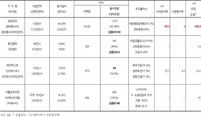 LH는 현재 4개의 PF 사업을 진행 중이다. 성남 판교의 알파돔시티는 934억 원을 투자해 현재까지 89.2억 원만 회수했다. 현재 지분평가액은 3억 원으로 손실액만 841.8억 원이다. 사실상 투자수익률은 △90%다.
