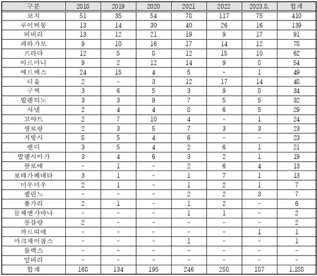 브랜드별로 살펴보면 코치가 약 410건으로 가장 많았고, 루이비통은 139건, 버버리는 91건을 기록했다.