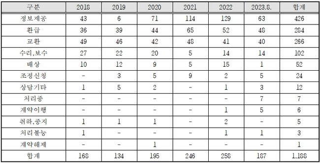 유 의원은 “소비자원에 접수되는 피해 건수에 비해 단순 정보제공에 그치는 건수가 너무 많다. 소비자원에서 진정으로 소비자를 보호하기 위해서는 문제를 적극적으로 해결하려는 자세가 필요하다”며, “소비자 피해 현황에 대한 실태조사 등을 통해 관련 기업에 소비자 보호 강화를 적극 권고해야 한다”고 말했다.