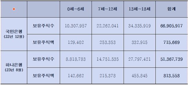 2023년 미성년자 주식보유 현황 (단위 : 주, 백만원) 금융감독원 제출 자료, 유의동 의원실 재구성유의동 의원(국민의힘, 경기 평택시을)이 금융감독원을 통해 주식 명의 개설 위탁업무를 하고 있는 KB국민은행, KEB하나은행으로부터 제출받은 자료에 따르면, 미성년자의 주식 보유액이 1조 5천억 원을 넘은 것으로 나타났다.