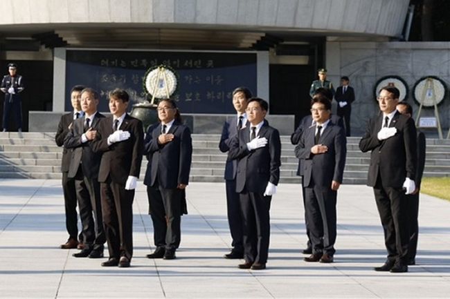 진교훈 서울 강서구청장(오른쪽 세 번째)이 12일(목) 당선 후 첫 공식 일정으로 서울국립현충원을 찾아 국기에 대한 경례를 하고 있다.