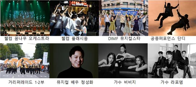 특히, ‘웰컴대학로’ 주제곡에 맞춰 함께 춤을 추는 플래시몹과 공중에서 펼쳐지는 공연 ‘웰컴 에어 콘서트’, 뮤지컬 배우 정성화, 여성 그룹 ‘비비지’ 등의 축하공연은 개막식을 더욱 화려하게 한다.