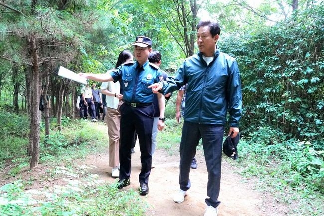 오세훈 서울시장(사진 오른쪽)이 지난 8월18일 오후 관악산 등산로 범죄현장으로 이동 중에 박민영 관악경찰서장(사진 왼쪽)으로부터 설명을 듣고 있다.